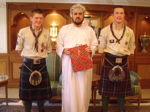 Graeme and Jamie also joined several meetings of Beavers and Cubs from the 1st Oman Scout Group, exchanging gifts from Deveron District, and also presented all the young people with various badges. Their kilts were also greatly admired by the youngsters, who had never seen them before.