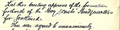 As well as approving the formation of Scottish Headquarters (see extract above), the meeting also saw those present pledging to support SHQ by ‘endeavouring to interest the public in the Movement and assisting in raising funds in support of the Scottish Central Office’. Office Bearers and Committee members were also elected and the Executive was approved.